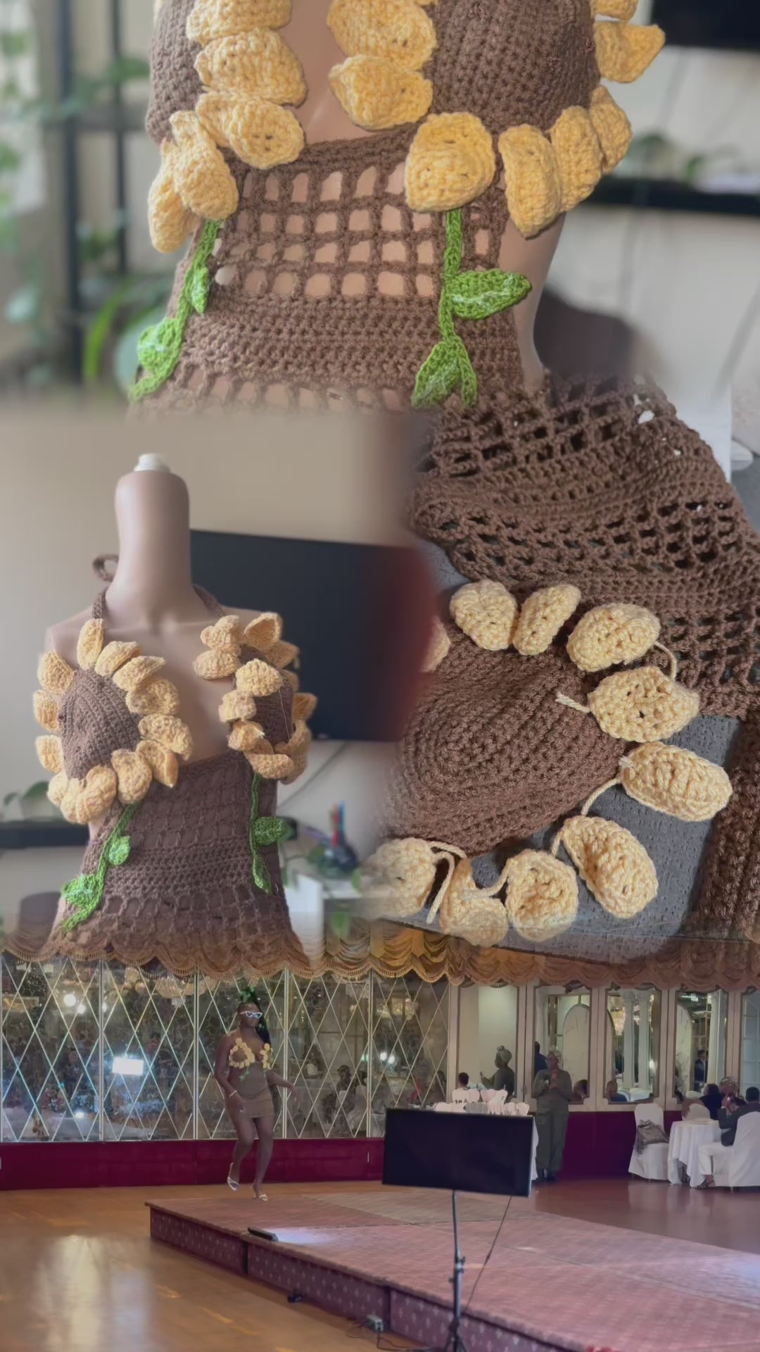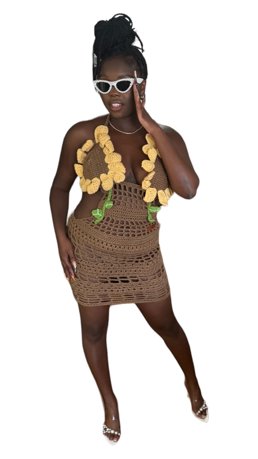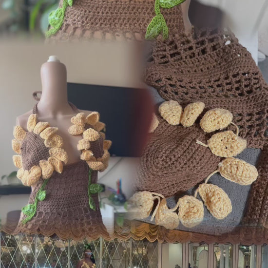 Unleash your inner goddess with this stunning brown crocheted halter dress, a true masterpiece of craftsmanship. Intricately handmade with a lace-like pattern, this dress features a breathtaking 3D sunflower bra design that brings life to the outfit, resembling sunflowers blossoming from a pot. The lifelike details of the sunflowers add a touch of nature's beauty, making this dress not just an outfit, but a work of art.